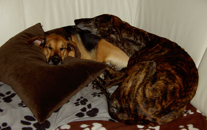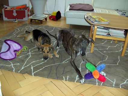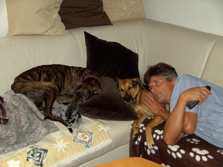 Torero ist ein quietschfideler Junggalgo und hat keine unerwarteten Macken. Er ist jetzt mal bei Susi und seinen zwei Brüdern Velero und Guapera eingezogen. Dort hat er mit affenartiger Geschwindigkeit mindestens zwei Tage lang die ganze Wohnung markiert. Er ist der zierlichste, aber lebendigste von den dreien und hat sich sehr gefreut, daß seine Brüder schon da sind. .