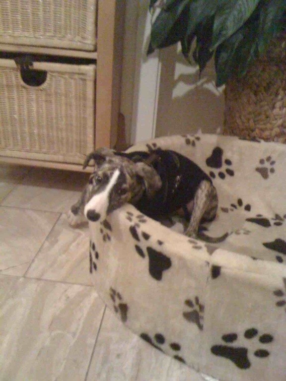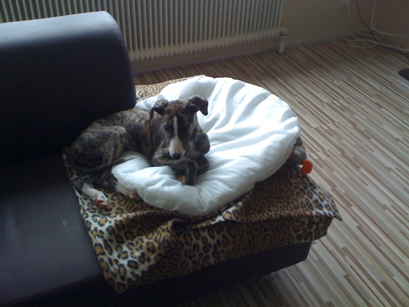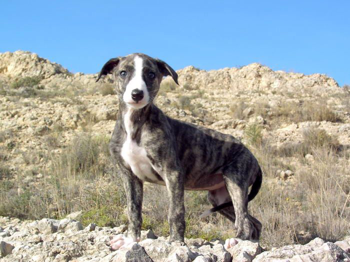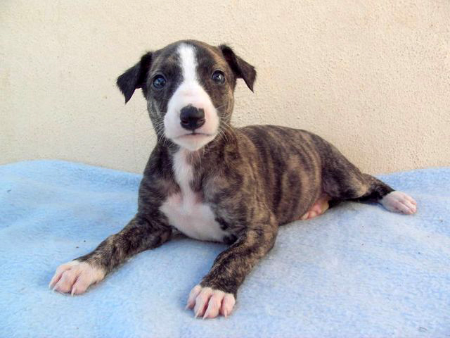 Leyla ist eine gestromte Hündin mit einem weißem Streifen über dem Gesicht. Die Galga wurde mit acht Geschwistern Ende Oktober in Spanien geboren. Sie wird geimpft, gechipt und entwurmt gegen Schutzgebühr und -vertrag abgegeben.
